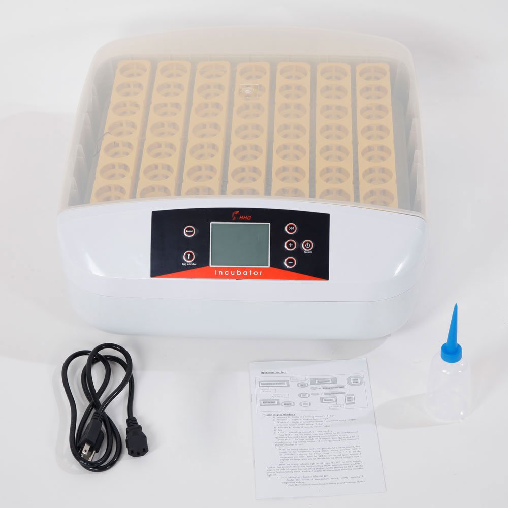 Introductions:Not just beautiful, this 56-Egg Practical Fully Automatic Poultry Incubator with Egg Candler is a practical gadget in our daily life. Getting rid of traditional boundedness, it is designed into visible style, allowing people to view the whole process of incubation. It could not only meet the date demand of scientific research, but also help to cultivate kid's curiosity. It is in mini size, lightweight for easy carry and operation. Once powered on, it'll keep stable and continuous working performance. It features steady temperature for best incubation condition. This is really a powerful device!Features:1. A good combination of superior material and delicate workmanship2. Durable and safe to use3. Allow 56pcs eggs to put in4. Good heat preservation and energy-saving performance5. With reasonable thermal cycle, providing optimal safeguard to incubation6. Convenient temperature control for instant grasp or adjustment of inner temperature7. High accuracy and good stability8. Mini size, lightweight for easy operation9. With built-in egg candlerNote: After using, clean the incubator and keep it dryProduct Upgrade Points: 1. Enhance hot air channel circulation and outward appearance2. Enlarged grid size to avoid chicks dropping down. Holes design changed to four sides with better hot air circulation to achieve more uniform temperature3. Changed egg turning system from downward to upward with integrated structure,easier to remove egg tray in hatcher period4. Make fan closer to grid to improve hot air circulation efficiency and achieve more uniform temperature. Upgrade humidity box with holes for better data accuracy5. Cover material changed from PP to PC to reduce deformation6. Changed inner heating system from ceramic heater to silicone heating wire7. Lower fan position to enlarge above space for fertilized eggsSpecifications:1. Color: White2. Weight: 141.10oz / 4000g3. Product Dimensions: (19.69 x 18.5 x 7.48)" / (50 x 47 x 19)cm4. Package Dimensions: (21.65 x 20.47 x 10.63)" / (55 x 52 x 27)cm5. Temperature Range: 20℃ ~ 40℃,℉=32 1.8×℃6. Voltage: 110V7. Frequency: 50Hz/60Hz8. Power: 80W9. Incubation Quantity: 56 pcs10. Plug: US Standard11. Suitable for: Chickens,Ducks,Geese and Other Poultry,Quail,Parrot,Pigeons and Other Birds12. Control System: Smart PID13. Certification: YesPackage Includes:1 x Incubator1 x Power Cable1 x Water Bottle1 x User Manual